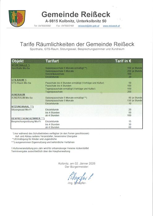 Tarife Räumlichkeiten der Gemeinde Reißeck