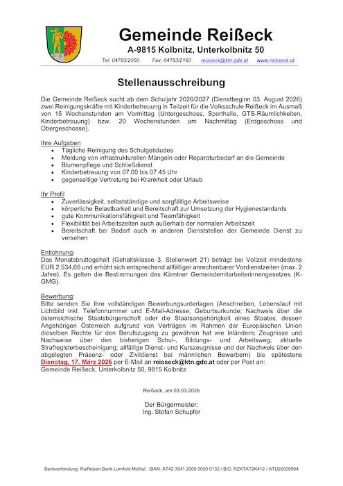 Die Gemeinde Reißeck sucht ab dem Schuljahr 2026/27 zwei Reinigungskräfte für die Volksschule Reißeck.